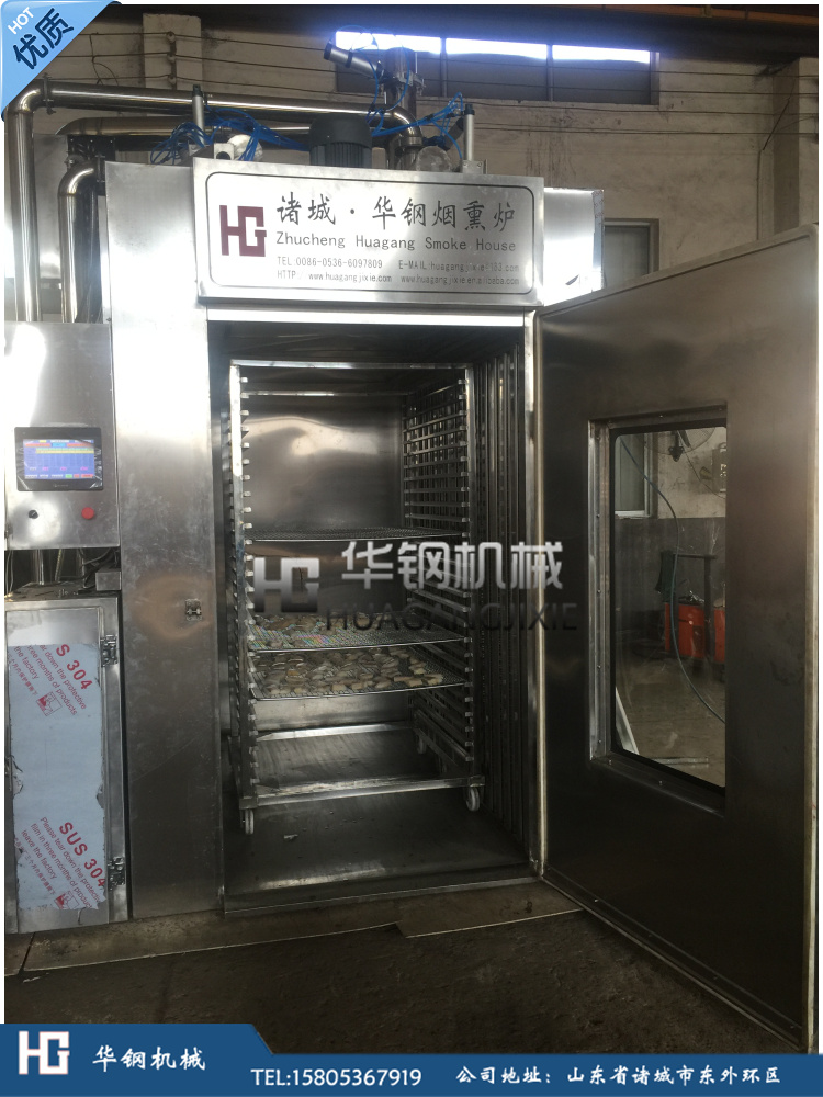 煙熏爐用于煙熏肉制品熟食,熏雞,熏鴨、熏鴿、烤腸,烤雞,熏魚,烤鴨,煙熏豆腐干臘肉以及家禽,水產品等等熏制產品,烘干,上色一次成型.煙熏色澤好,口感更佳.質量保證,技術優良,操作方便.經過煙熏后食品的顏色好看,還有一種煙熏后的香味,讓人感覺香而不膩,也能達到環保效果,代替了傳統的煙熏爐方法,節省了工人的勞動力,提高工作效率,更增強了食品的口感及彈性。主循環風扇送風均勻,使爐體內溫度均勻,采用設定參數方式,通用性廣,自動運行中的參數可修正。