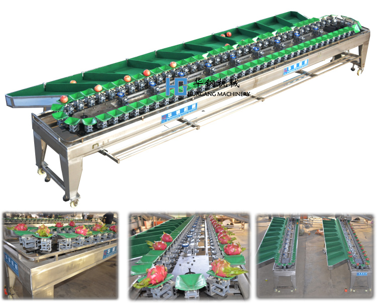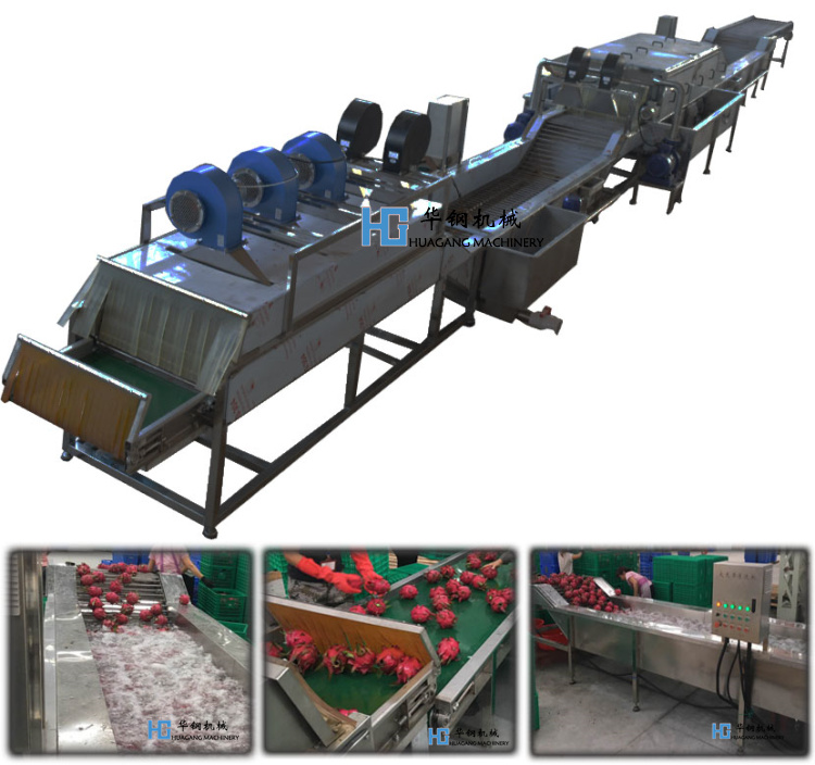 火龍果清洗之后可加上風干機部分,風干機是采用常溫風對火龍果表面水份進行吹干。可根據需求定做增加風干機,風干后的火龍果可進行稱重選果,根據稱重等級來劃分火龍果大小進行分級裝袋,裝箱 便于入冷庫。