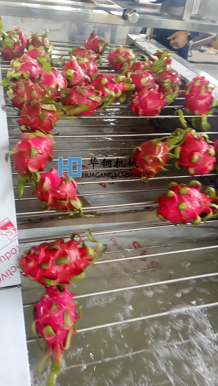 我們公司生產的火龍果清洗機打破傳統的網帶式傳動,現在使用的是滾杠式網帶,這樣在提升爬坡部分火龍果不會掉下來,不會碰壞火龍果表面。