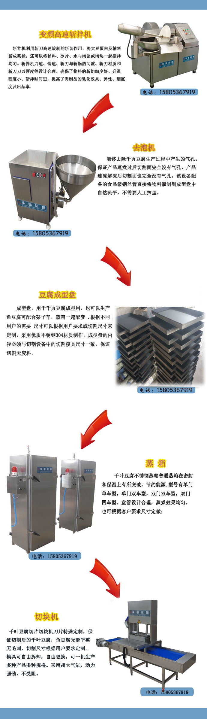 高速斬拌機(jī)、蒸箱,成型架車盤子,屬于必須設(shè)備。輔助設(shè)備切絲機(jī),切塊機(jī),去泡機(jī),切丁機(jī),切片機(jī)、鹵鍋、拌料機(jī)等,通過輔助設(shè)備生產(chǎn)不同產(chǎn)品的新式成品。銷量火爆,成本低,大豆蛋白便宜,成本低,售價(jià)大家都能接受,所以,選擇千頁豆腐生產(chǎn)設(shè)備 制作千葉豆腐在鄉(xiāng)村很暢銷。選擇千頁豆腐設(shè)備生產(chǎn)千頁豆腐售賣利潤高,銷量大,是近幾年比較暢銷的一個(gè)項(xiàng)目,如果需要就來華鋼看看,千頁豆腐的廠家,15年老企業(yè),設(shè)備,技術(shù)都比較好。