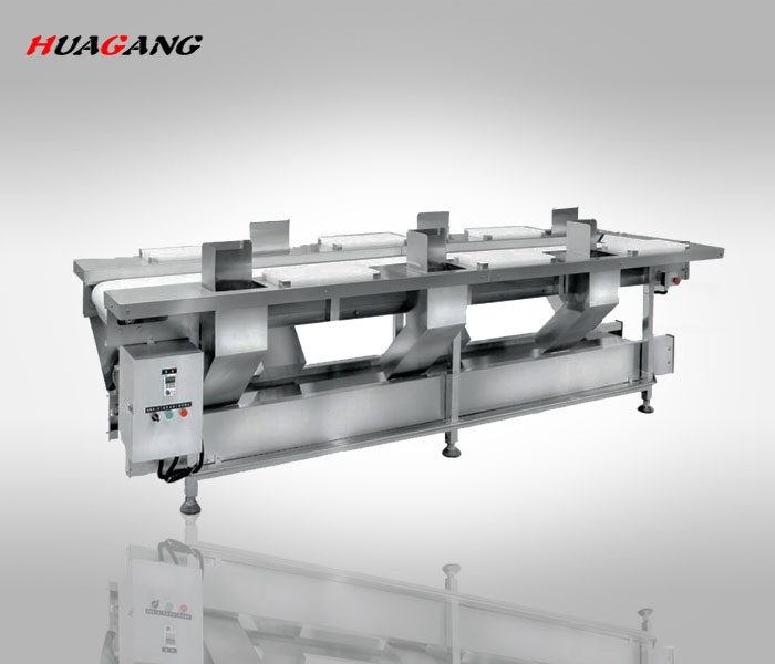 自動流水式工作臺兩邊設有工作崗位,崗位上設置砧板,廢料口,刀具存放槽。標準為三層式,原材料在中層運送,經由工人挑選除雜后的良品放到上層; 廢品,爛菜葉,毛發等雜物通過工作臺廢料口投放到下層輸送帶運至廢品收集車(收集車需要另外定做)。