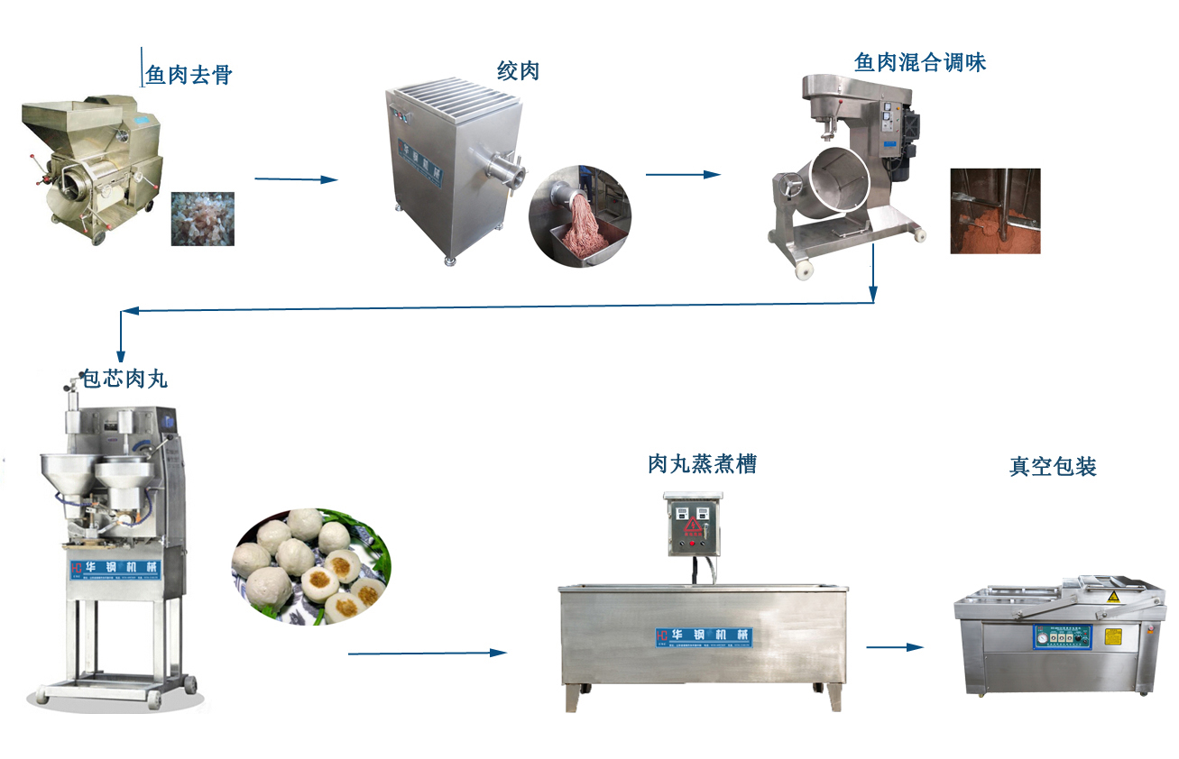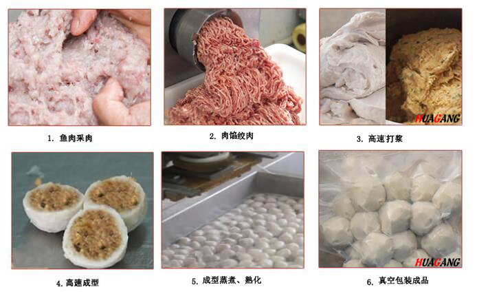 去除魚骨(魚肉采肉機)→肉泥絞肉(絞肉機→與調(diào)味料混合打漿(打漿機)→肉丸成型→煮沸→冷卻→包裝(冷凍產(chǎn)品)