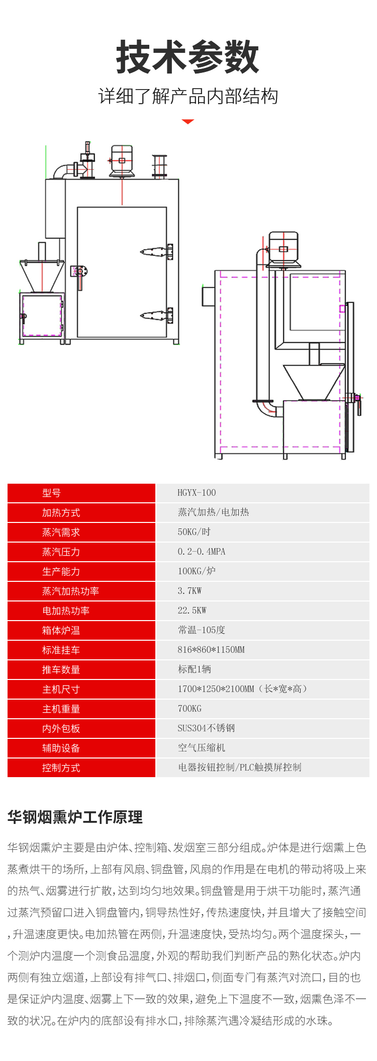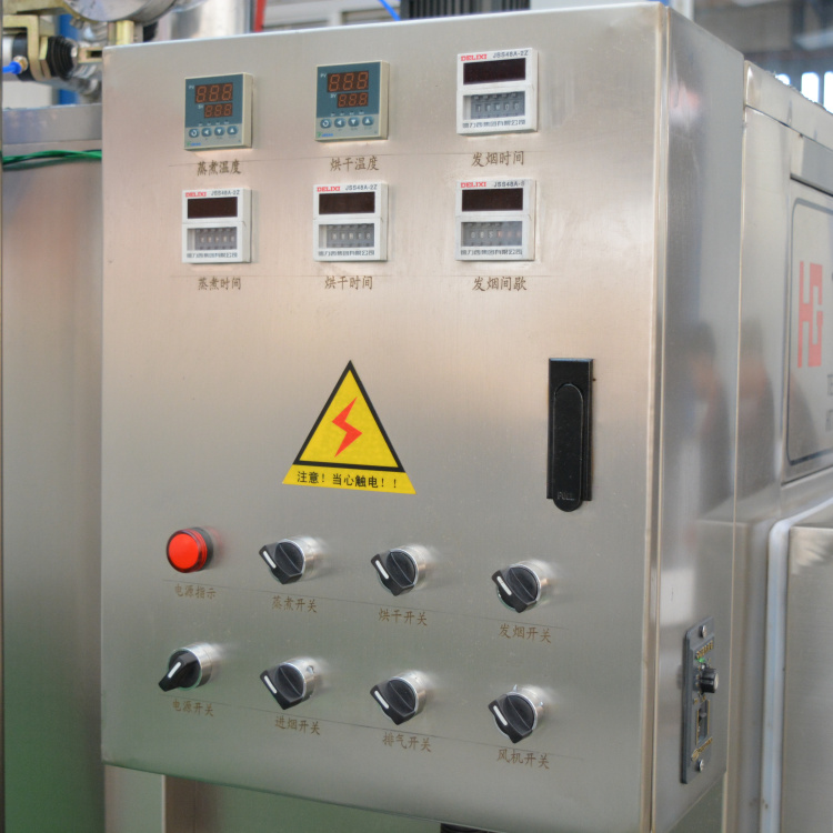 華鋼系列煙熏爐干燥、蒸煮、煙熏三工序可按設定時間自動轉換,溫度按設定值自動調節,工序結束自動顯示;主循環風扇送風均勻,使爐體內溫度均勻,該機特別采用了雙層不銹鋼散熱器,對爐溫升溫迅速,干燥效果好,而目前國內煙熏爐同關產品采用盤管式加熱器,兩者的升溫效果是無法比擬的。采用設定參數方式,通用性廣,自動運行中的參數可修正。