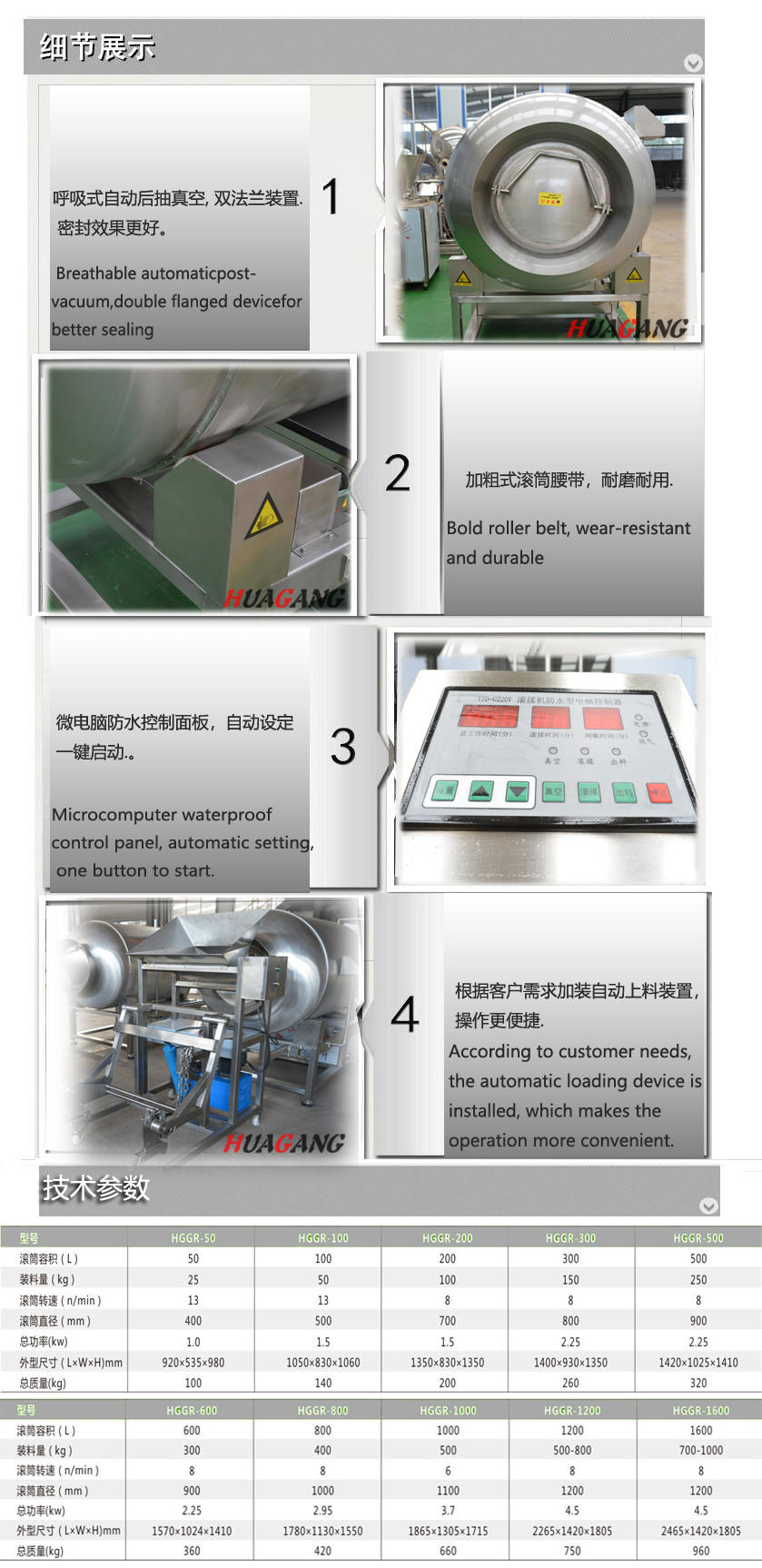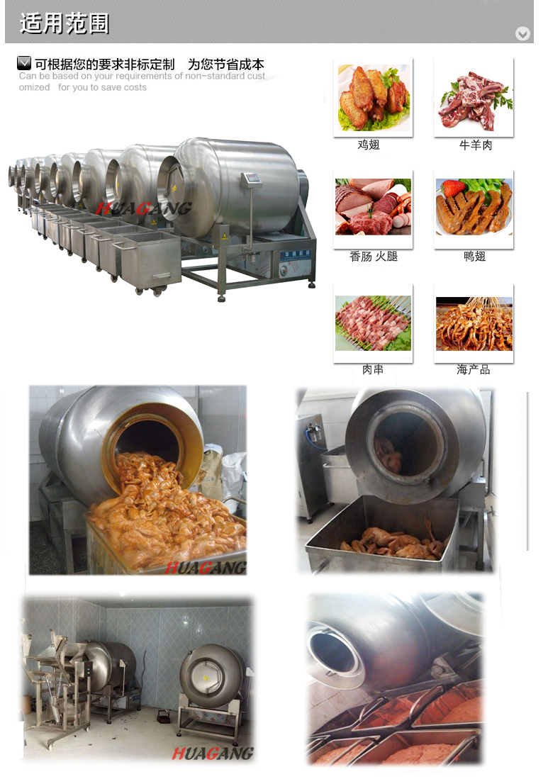 滾揉機(jī)中的真空有很多好處使產(chǎn)品在真空狀態(tài)下滾揉,會(huì)使產(chǎn)品物理體積得到彭大松軟。使做出來的產(chǎn)品口感更好,產(chǎn)品在真空狀態(tài)下滾揉會(huì)使產(chǎn)品在摩擦、摔打時(shí)減少熱量的產(chǎn)生。且在真空狀態(tài)下產(chǎn)品不會(huì)氧化。因此不會(huì)使產(chǎn)品在滾揉過程中變質(zhì)。滾揉機(jī)產(chǎn)品在真空狀態(tài)下物理組織膨松,有利于輔料的吸收.