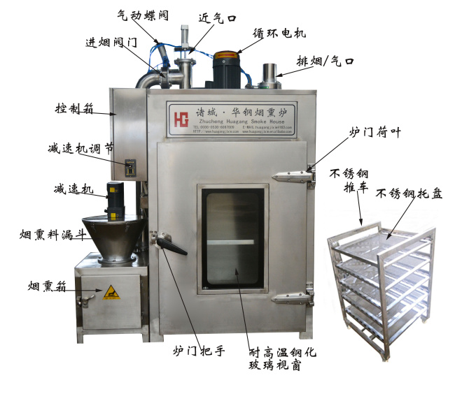 煙熏爐的煙熏箱上部為鋸沫箱,由減速機(jī)帶動(dòng)攪拌機(jī)構(gòu),鋸沫周期地送與下部發(fā)煙爐盤(pán)的電熱器,由電控箱上的發(fā)煙開(kāi)關(guān)按鈕控制,鋸沫受熱發(fā)煙,被風(fēng)機(jī)吸入主機(jī)以熏制熟食品。