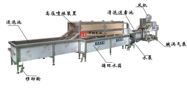 3.設(shè)備帶有高壓噴淋裝置(上下噴淋清洗,360度無(wú)死角),在清洗結(jié)束后輸送至下道工序過(guò)程中,對(duì)產(chǎn)品進(jìn)行二次氣泡清洗,可加入臭氧殺菌裝置,延長(zhǎng)產(chǎn)品的保質(zhì)期;