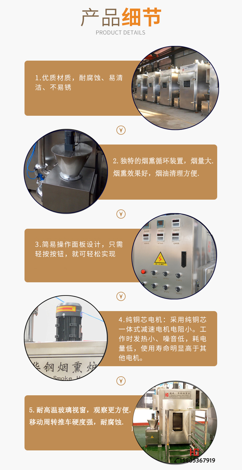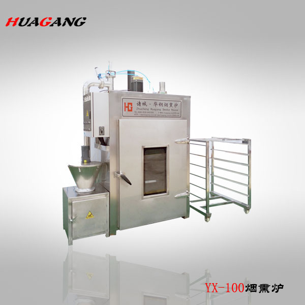 煙熏爐是各種香腸,臘肉,熏雞、烤鴨等肉產品,煙熏豆腐干等不可缺少的設備之一,具有蒸,烘烤、煙熏、排風等功能。根據客戶的反饋以及市場的需求,經過多年的摸索探索研制生產,加熱升溫裝置有蒸汽加熱或者電熱管加熱,同時集成了循環控制,發煙,烘烤干燥等系統,煙熏的過程縮短,提高生產效率;并能控制煙熏料(果木,木屑,稻殼米糠,白砂糖)的量,幫助生產企業有效控制了成本,對產品進行了性能高,設備更合理的改進,使其加熱速度、烘干效果、煙熏效果都達到了理想的效果。從而為用戶提供了更好、更可靠、更衛生和經濟的選擇。該設備整體設計新穎、加工精制,美觀。整體采用不銹鋼制作,采用耐高溫聚氨酯發泡材料保溫,保溫效果好、升溫快,節約能源。該設備的循環系統采用雙速循環風機,合理的分配進風、排風、補風機構,大限度優化箱體內部氣流循環狀態,確保整個箱體物料加工過程中可控、均勻,達到了低耗產出。而關于電氣控制方式,該設備采用可編程控制器及繼電器,電磁閥等關鍵電氣元件均采用進口產品,操作簡便,可自動控制時間,爐內溫度。具有優異的發煙及循環系統,可使爐內的煙霧均勻分布,從而使肉制品著色均勻,色澤美觀,保證產品具有較高的出品率。符合國內消費者的消費意識和相關部門對此類產品在食品安全的相關規定。