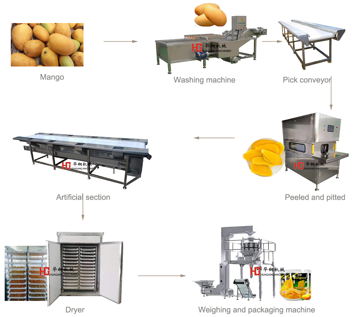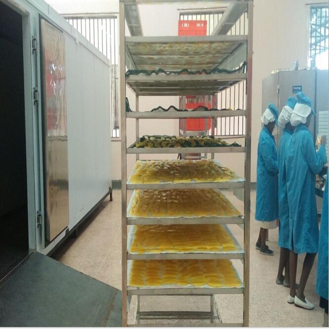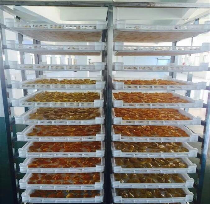 將處理后的芒果原料均勻放于烘干架子(護色處理的要先瀝干水分),放入熱泵芒果烘干機房里干燥。干燥初期溫度控制在70-75℃,后期控制在60-65℃,干燥過程注意翻轉、回濕等操作。回軟、包裝待產品達到干燥要求的水分含量時,一般為15-18%左右,將產品置于密閉容器中,讓其回軟,使各部分含水量均衡,質地柔軟,以便包裝。