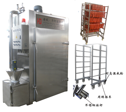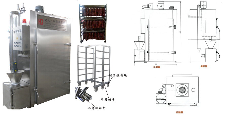 華鋼煙熏爐主要是由爐體、控制箱、發煙室三部分組成。爐體是進行煙熏上色蒸煮烘干的場所,上部有風扇、銅盤管,風扇的作用是在電機的帶動將吸上來的熱氣、煙霧進行擴散,達到均勻地效果。銅盤管是用于烘干功能時,蒸汽通過蒸汽預留口進入銅盤管內,銅導熱性好,傳熱速度快,并且增大了接觸空間,升溫速度更快,節能。電加熱管在兩側,升溫速度快,受熱均勻。兩個溫度探頭,一個測爐內溫度一個測食品溫度,外觀的幫助我們判斷產品的熟化狀態。爐內兩側有獨立煙道,上部設有排氣口、排煙口,側面專門有蒸汽對流口,目的也是保證爐內溫度、煙霧上下一致的效果,避免上下溫度不一致,煙熏色澤不一致的狀況。在爐內的底部設有排水口,排除蒸汽遇冷凝結形成的水珠。