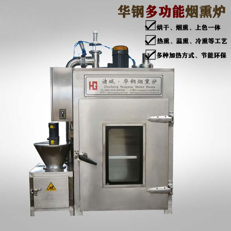 華鋼煙熏爐主要是由爐體、控制箱、發煙室三部分組成。爐體是進行煙熏上色蒸煮烘干的場所,上部有風扇、銅盤管,風扇的作用是在電機的帶動將吸上來的熱氣、煙霧進行擴散,達到均勻地效果。銅盤管是用于烘干功能時,蒸汽通過蒸汽預留口進入銅盤管內,銅導熱性好,傳熱速度快,并且增大了接觸空間,升溫速度更快,節能。電加熱管在兩側,升溫速度快,受熱均勻。兩個溫度探頭,一個測爐內溫度一個測食品溫度,外觀的幫助我們判斷產品的熟化狀態。爐內兩側有獨立煙道,上部設有排氣口、排煙口,側面專門有蒸汽對流口,目的也是保證爐內溫度、煙霧上下一致的效果,避免上下溫度不一致,煙熏色澤不一致的狀況。在爐內的底部設有排水口,排除蒸汽遇冷凝結形成的水珠。
