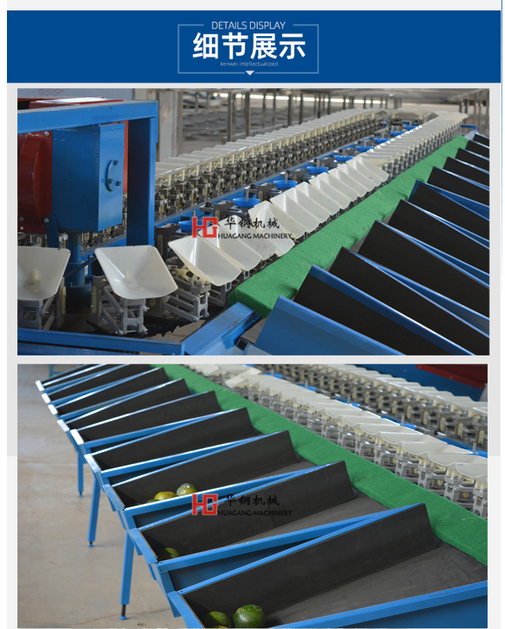 8、的預排列技術。只需人工將水果倒在輸送帶上,系統自動將水果進行排隊。