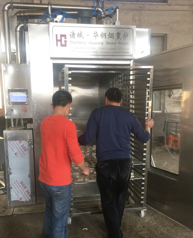 煙熏根據處理溫度的高低可將煙熏分為冷熏、溫熏、熱熏,這三者沒有明顯的界線,各自劃分的溫度區域也不盡相同。在日本把0~30℃定為冷熏,30~50℃為溫熏,50~80℃為熱熏,80℃以上的稱為烘熏。加熱和干燥對發生美拉德反應起著促進作用,因此熱熏產品的色澤明顯好于冷熏,但是熱熏時由于溫度過高,肌肉蛋白質要產生熱變性,脂肪熔化,使產品品質發生改變。另外,隨著爐溫的升高,被煙熏的肉制品表面迅速干燥,表面過早干結,反而會阻礙對煙霧的吸收,而冷熏則不會引起上述變化。一般情況下,熱熏時間短,冷熏時間長,對于非加熱的產品常采用冷熏的方式,有的產品需要冷熏半日至數日之久。如果主要想提高煙熏香味的嗜好性,又想延長制品的保存期,也可以采用溫熏的方式,它可以有利于特定的、有益菌為主菌群的形成。至于采用何種熏制方式,這與產品的類型及人們的嗜好口味有關。