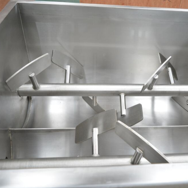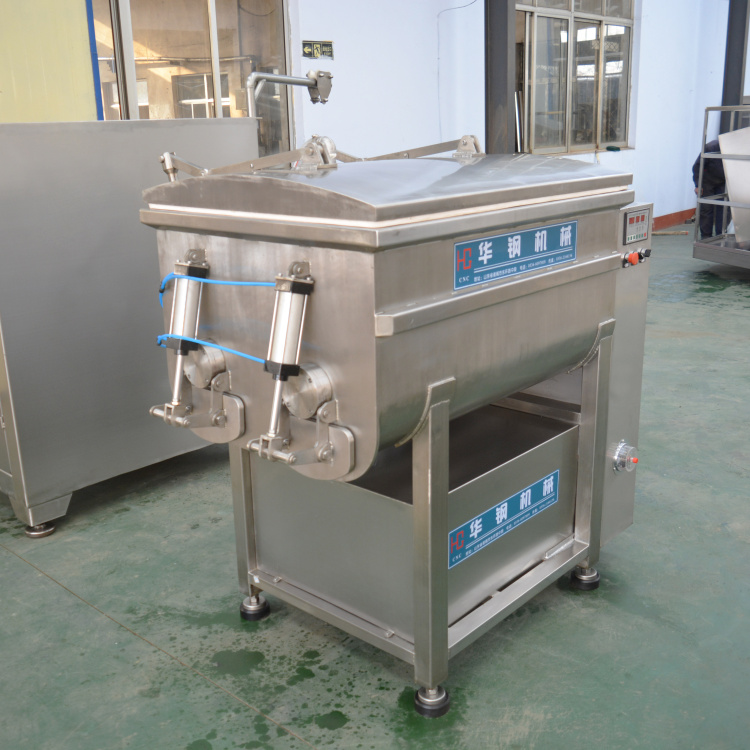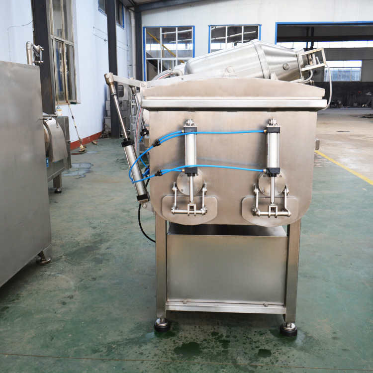 通過真空裝置使物料處于負壓狀態。使物流充分膨脹,無氣泡,彈性好,色澤鮮艷。并大大的限度的提取蛋白質,是改善產品品質的理想設備。采用平行雙軸結構,斜板式槳葉,物料在料斗中翻動的同時作圓周運動,使各種物料攪拌的更加均勻.采用雙速雙動力,根據所拌餡料的種類及工藝選擇不同的轉速和不同的運轉方式進行攪拌。真空密封裝置全部采用符合衛生標準的 密封件。在真空狀態下,餡料攪拌均勻,充分膨脹,彈性好,色澤鮮艷并大限度地提高蛋白質。上蓋及排料門的密封用 硅膠條,操作方便,可靠耐用.