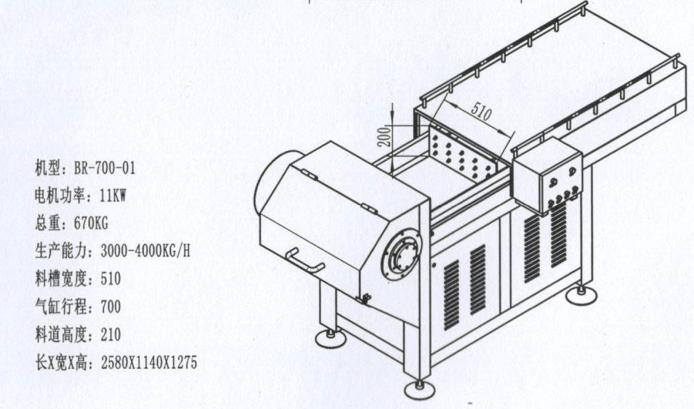 1.加工原料規格600×400×150/200(mm),每塊2.5~25kg、-4℃~-18℃的凍肉,可直接切成塊狀或片狀,是斬拌機和絞肉機的前道工序。