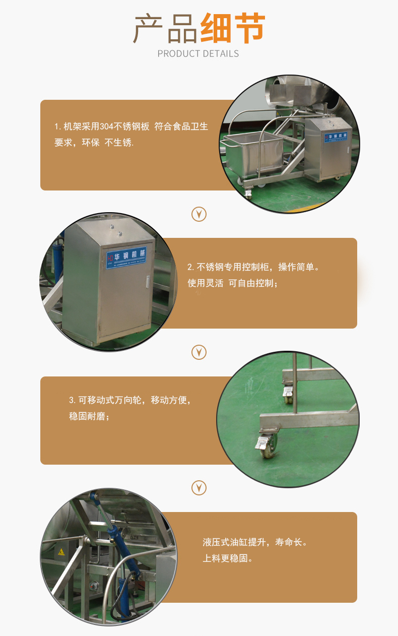 本提升機適應大、中、小型肉類食品加工廠,是為滾揉機、灌腸機、攪拌機、絞肉機等設備提供物料的設備。本機采用304不銹鋼制作,設備可自由移動,更加方便快捷,減輕了勞動強度,提高了生產效率。