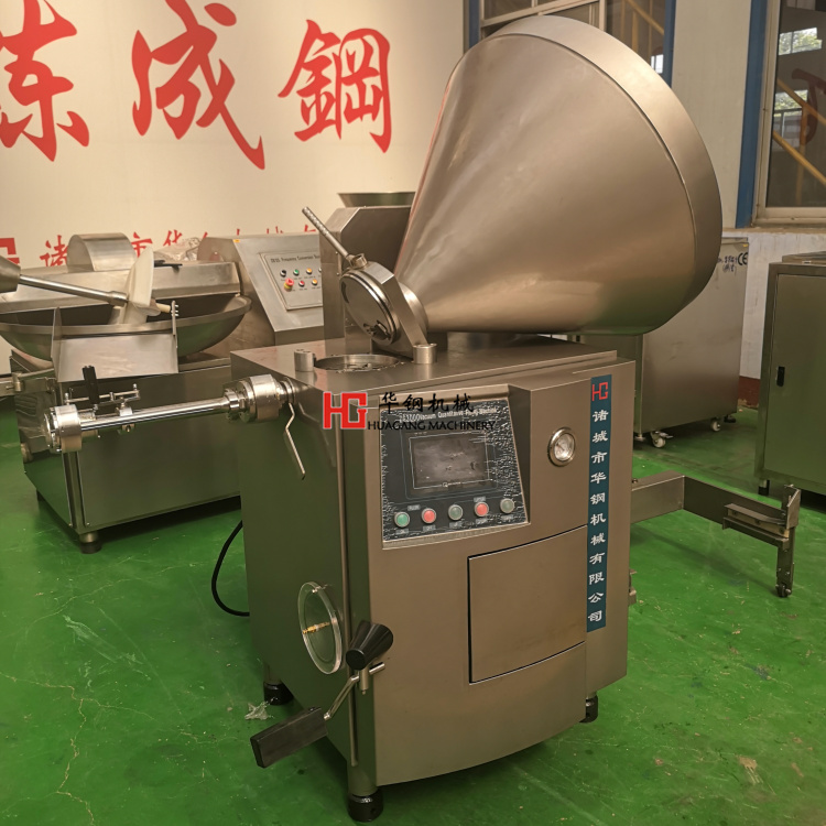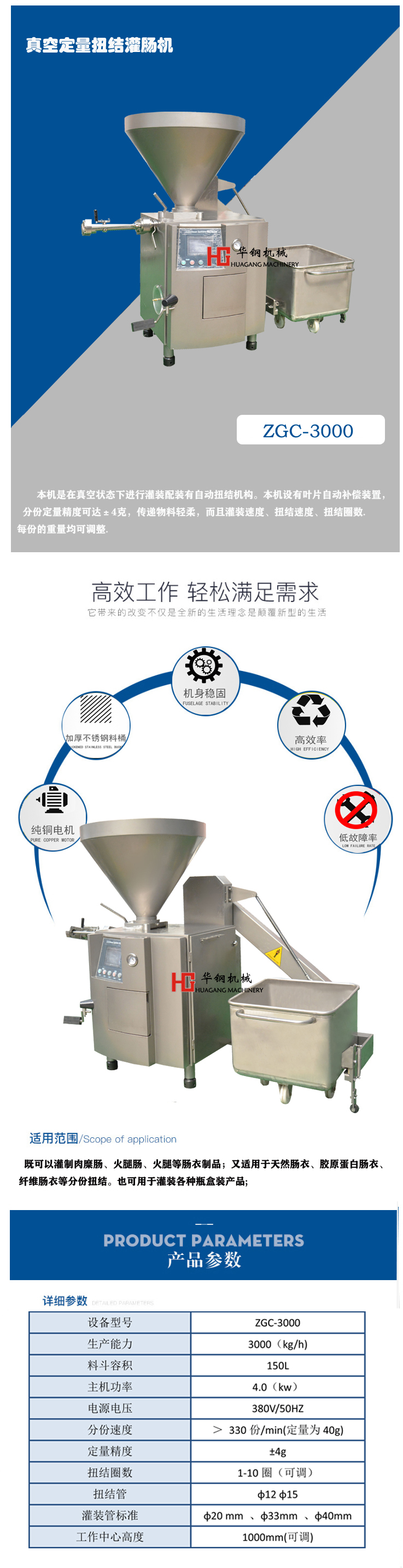 本機是由葉片泵充填、伺服電機驅(qū)動、觸摸屏顯示、微機控制的全自動真空定量灌裝機,配裝有自動扭結(jié)機構(gòu)。既可以灌制肉糜腸、火腿腸、火腿等腸衣制品;又適用于天然腸衣、膠原蛋白腸衣、纖維腸衣等分份扭結(jié)。也可用于灌裝各種瓶盒裝產(chǎn)品.本機設(shè)有葉片自動補償裝置,分份定量精度可達±4克,傳遞物料輕柔,而且灌裝速度、扭結(jié)速度、扭結(jié)圈數(shù)、每份的重量均可調(diào)整。本機是在真空狀態(tài)下進行灌裝,本機料斗可翻轉(zhuǎn),清洗更加方便。本機選用 不銹鋼材料制造,關(guān)鍵部件經(jīng)特殊處理,經(jīng)久耐磨,控制部分均采用進口元件,外觀經(jīng)過表面工藝處理,美觀大方,結(jié)構(gòu)緊湊,操作方便,維護保養(yǎng)便捷,設(shè)有安全防護裝置,是肉類加工業(yè)的理想設(shè)備.