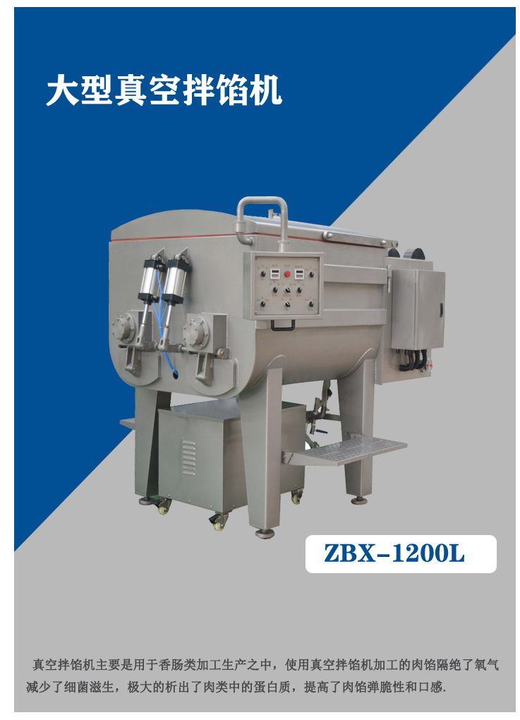 真空拌餡機的種類:大型真空拌餡機、小型真空拌餡機、試驗室實驗用真空拌餡機真空拌餡機是用于混料的設備,效率高,便于操作,是制作風干腸類產品、粒狀、泥狀混合腸類產品、丸類產品的 設備,同時也是生產水餃、餛飩類面食產品的可選設備。