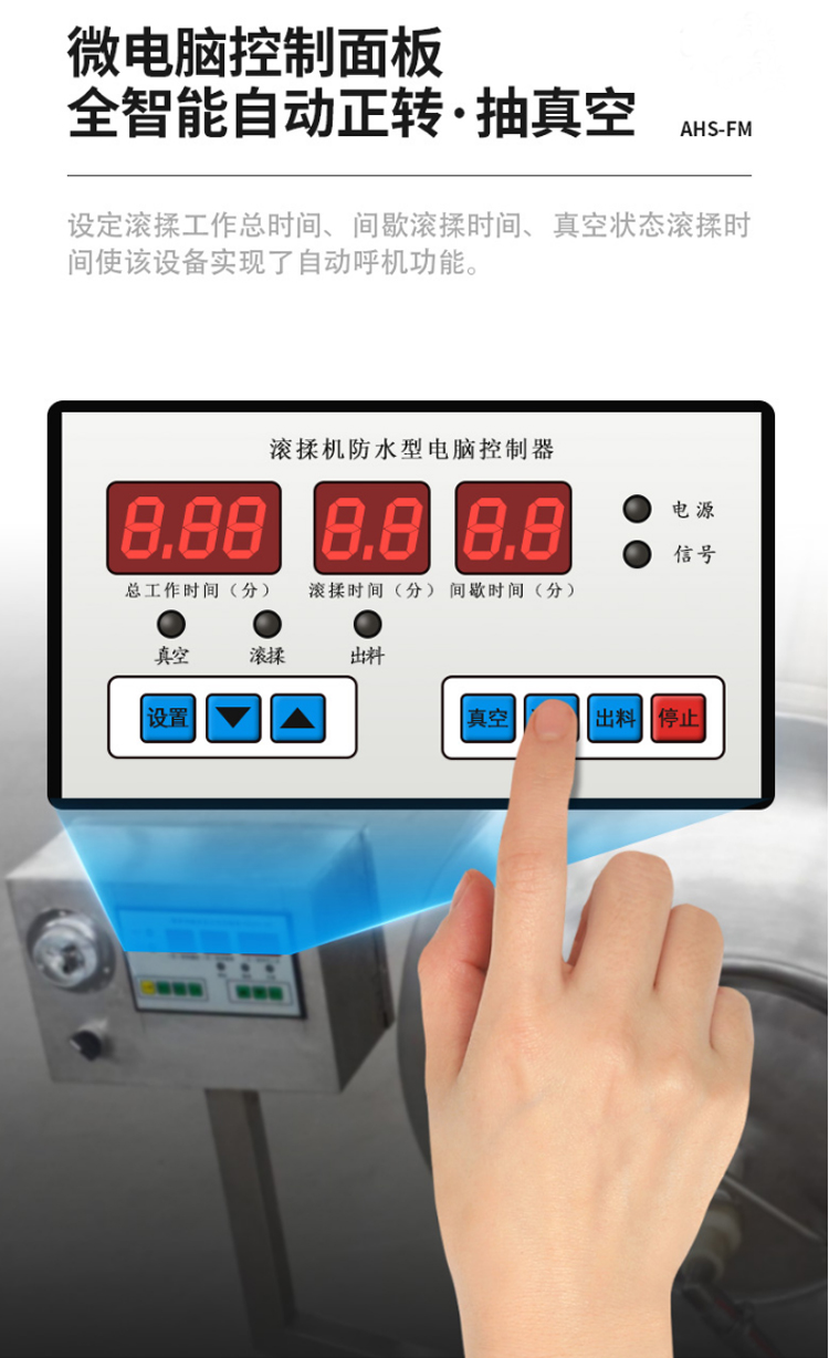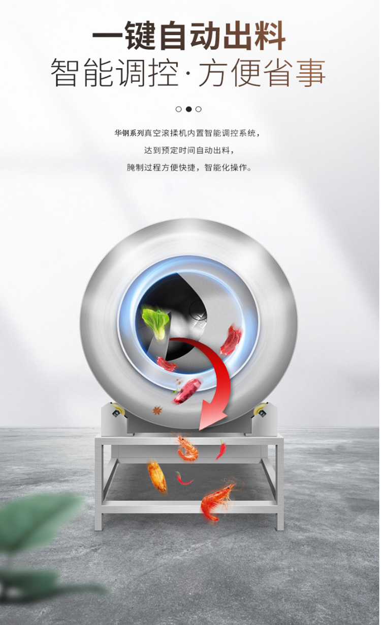 真空滾揉機是在真空狀態下,利用物理沖擊的原理,讓肉在滾筒內上下翻動,相互撞擊、摔打,達到按摩、腌漬作用,使肉均勻的吸收腌漬,提高肉的結著力及產品的彈性,通過滾揉、按摩能使肉體蛋白質分解成水溶性蛋白,易被人體吸收,同時能使添加料(淀粉等)與肉體蛋白質互為融合以達到肉質變嫩,口感好,出口率高。本機具有肺呼吸功能,讓產品在滾筒內膨脹、縮小了往復運動,改善了肉組織的結構,提高了切面效果。該機采用不銹鋼制造,結構緊湊,滾筒兩端均采用旋壓式封帽結構,大大的增加滾筒內的摔打空間,使滾揉產品的效果均勻,噪音小,性能可靠,使用效率高。