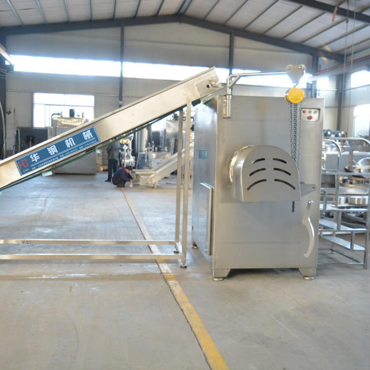 凍肉絞肉機工作主要靠旋轉的螺桿將料斗中的原料肉推擠到絞刀箱中的預切孔板處,利用轉動的切刀刃和孔板眼刃形成的剪切作用將肉切碎,并在螺桿擠壓力的作用下,將肉料不斷排出孔板外。是肉食品加工中常用的一種切割機器,它可根據肉食品加工工藝要求,配用不同孔徑的網眼板,把原料肉切割成多種大小不同的顆粒。
