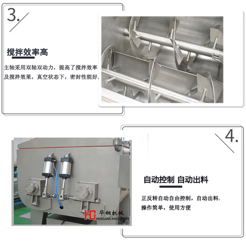 1、真空拌餡機采用平行雙軸結構,斜板式槳葉,物料在料斗中翻動的同時作圓周運動,使各種物料攪拌的更加均勻,沒有死角。