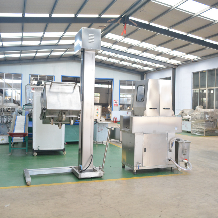 整機采用不銹鋼材質,分為移動式和固定式兩種機型,T200型提升機是專為200L標準肉車配套的提升設備,        其功能是將物料提升到一定高度后,傾倒至設備的料斗中,以完成加料工作。該機采用全不銹鋼材料制造,鏈條傳動,便于清洗,美觀耐用。。具有運行平穩、安全可靠、易于清潔、操作方便等優點,采用進口雙行程開關控制。工藝技術.