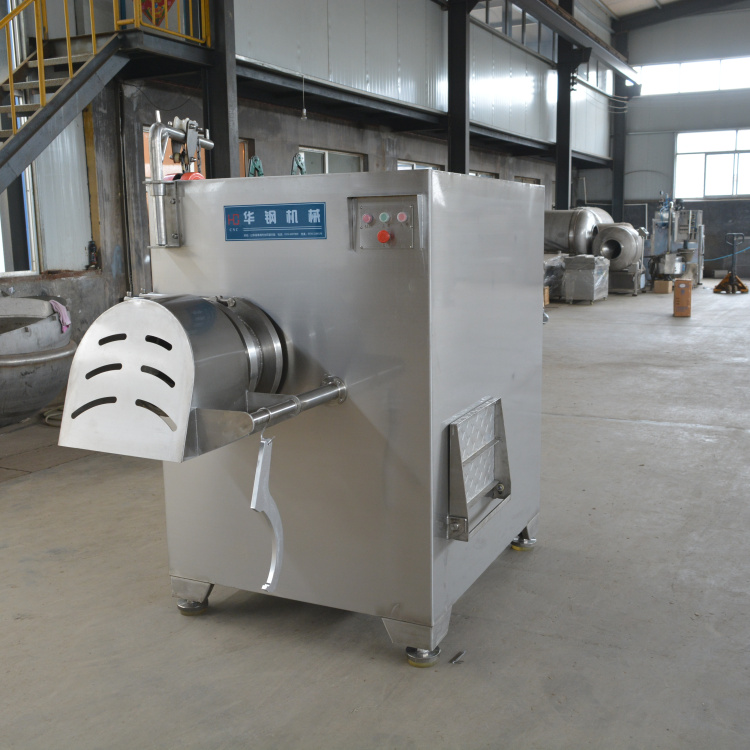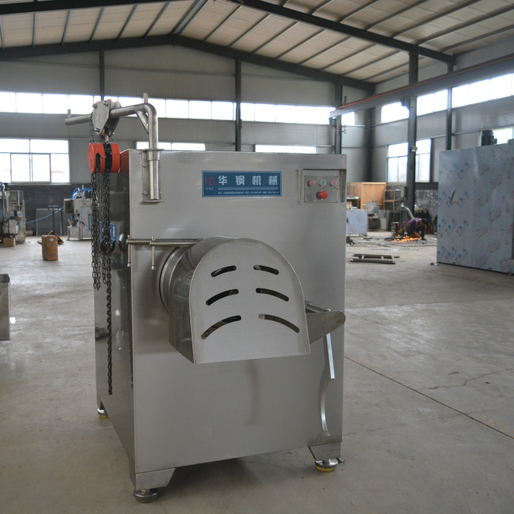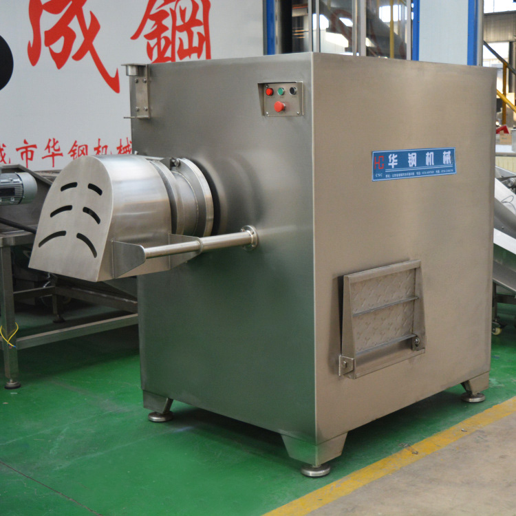 凍肉絞肉機工作主要靠旋轉的螺桿將料斗中的原料肉推擠到絞刀箱中的預切孔板處,利用轉動的切刀刃和孔板眼刃形成的剪切作用將肉切碎,并在螺桿擠壓力的作用下,將肉料不斷排出孔板外。是肉食品加工中常用的一種切割機器,它可根據肉食品加工工藝要求,配用不同孔徑的網眼板,把原料肉切割成多種大小不同的顆粒。