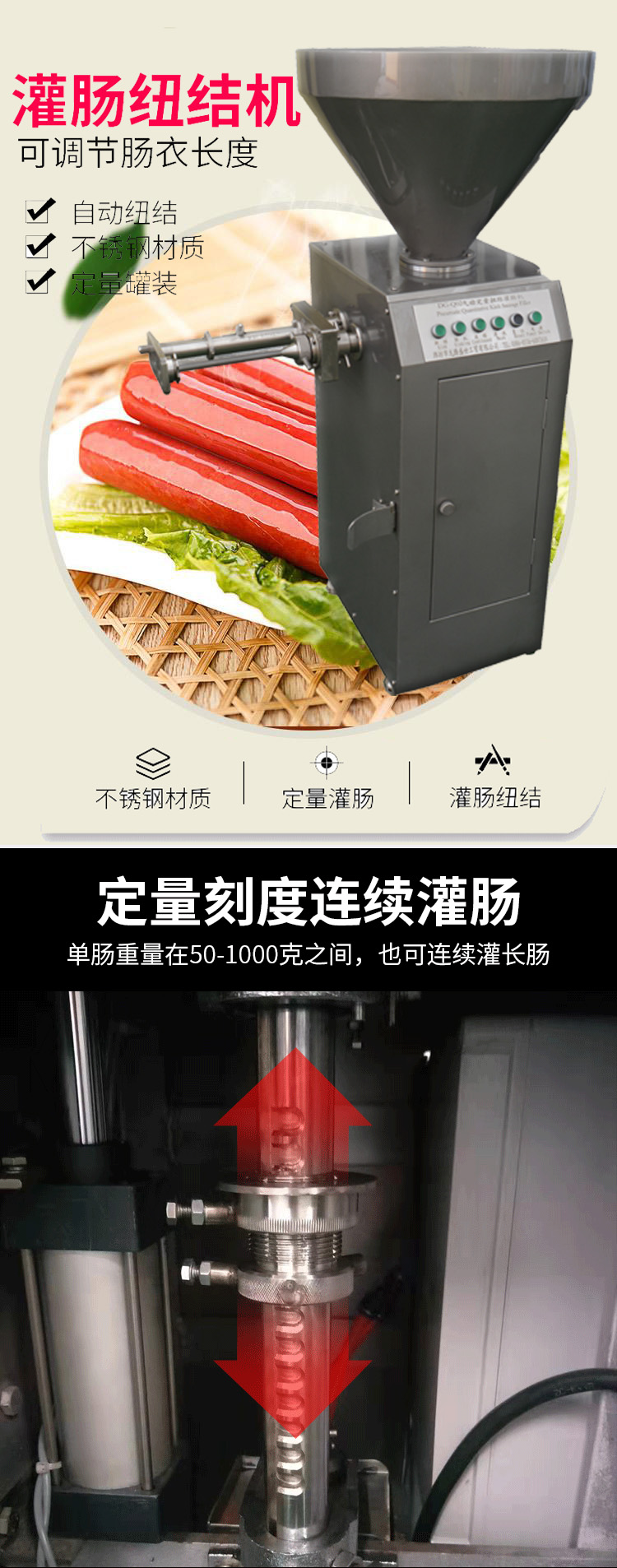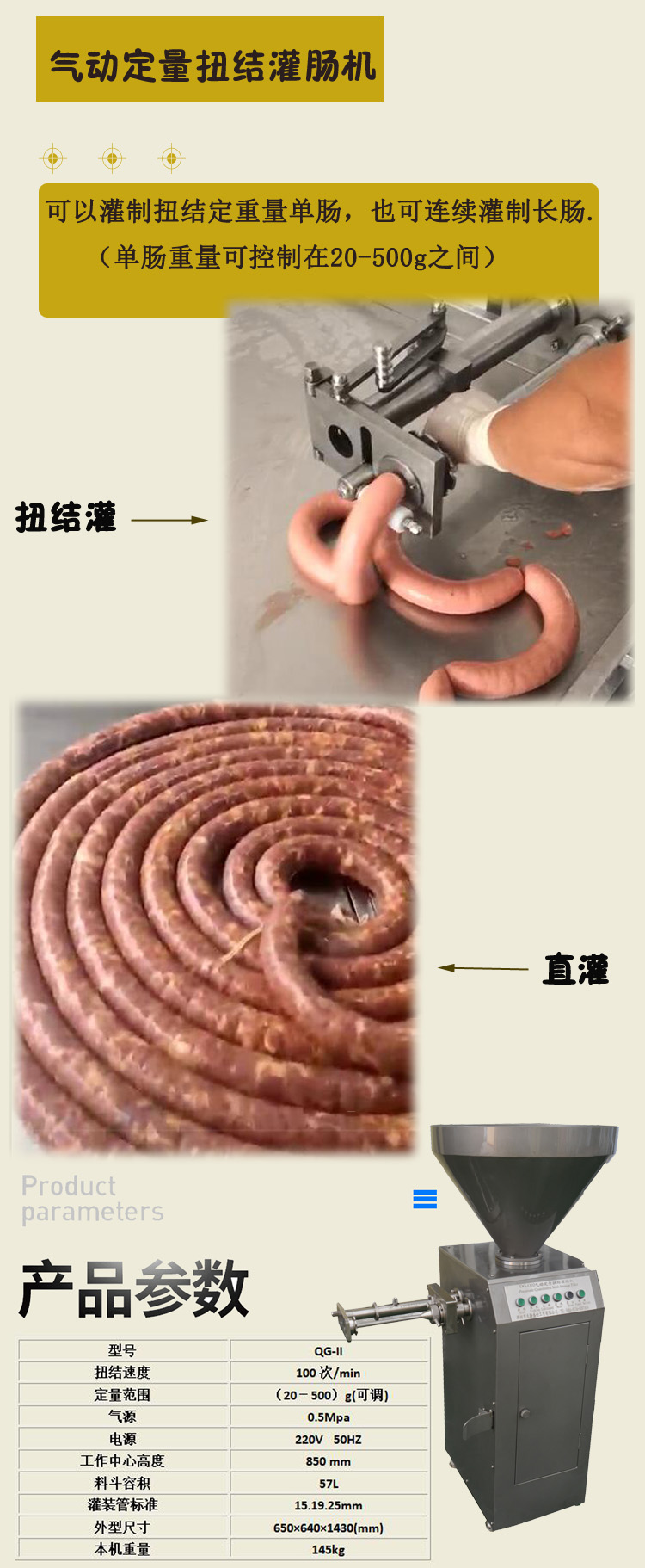 氣動(dòng)定量扭結(jié)灌腸機(jī)外形美觀(guān),小巧玲瓏。與肉食接觸部分及外包裝全部采用不銹鋼制造。易于清洗,定量可在20-500克之間任意可調(diào),誤差僅有3克左右。氣動(dòng)定量扭結(jié)灌腸機(jī),采用控制閥開(kāi)關(guān)汽缸來(lái)調(diào)整加工產(chǎn)品所屬重量,通過(guò)操作面板上按鈕達(dá)到控制各個(gè)程序動(dòng)作的目的。該設(shè)備是在定量灌腸機(jī)的基礎(chǔ)上加以研制的灌腸設(shè)備,該機(jī)既能定量灌腸又能自動(dòng)扭結(jié),改變了過(guò)去定量灌腸扭結(jié)不能一次完成的不足,該機(jī)性能穩(wěn)定,操作安全可靠,在原有的基礎(chǔ)上提高了生產(chǎn)效率.