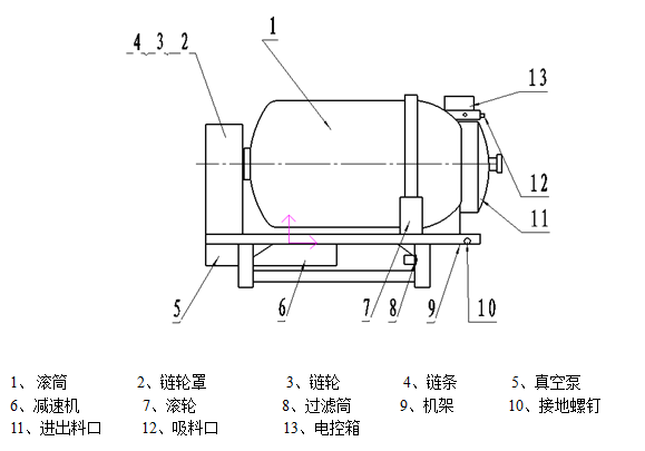 真空滾揉機主要滾筒部分、傳動部分、真空系統、電控部分等組成。
