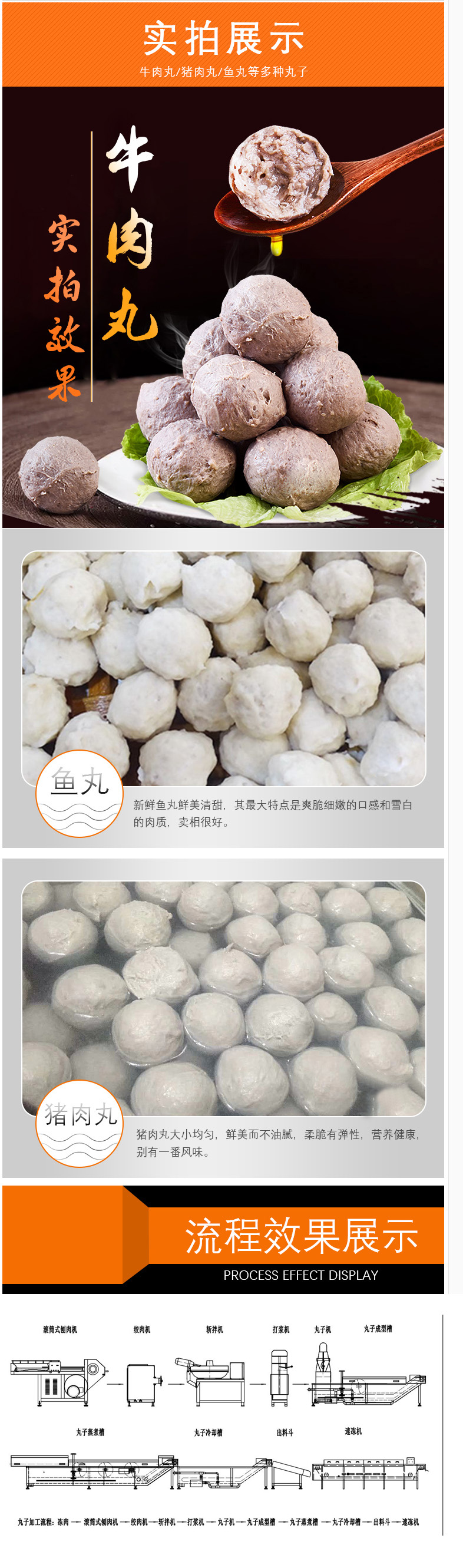 丸子生產(chǎn)線加工工藝流程:凍肉前期處理(解凍)→凍肉刨肉機(jī)→凍肉絞肉機(jī)→斬拌機(jī)→打漿機(jī)→肉丸成型蒸煮冷卻生產(chǎn)線→包裝→速凍。