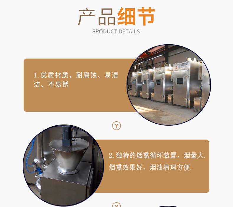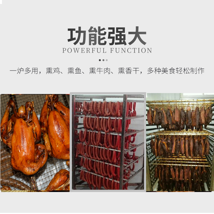 具有熱風(干燥或烘烤)蒸煮、煙熏、排風等功能。主要有主機(爐體)發煙裝置、主管路、高壓蒸汽系統、低壓蒸汽系統、電器控制部分等系統組成。