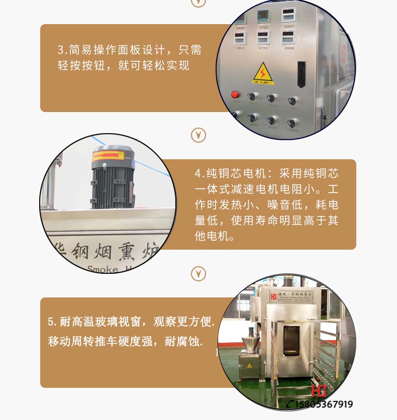 華鋼系列YX-250煙熏爐采用自動可編程控制,操作方便簡單。干燥、蒸煮、煙熏三工序可按設定時間自動轉換,溫度按設定值自動調節,工序結束自動顯示;主循環風扇送風均勻,使爐體內溫度均勻,該機特別采用了雙層不銹鋼散熱器,對爐溫升溫迅速,干燥效果好,而目前其他廠家煙熏爐同關產品采用盤管式加熱器,兩者的升溫效果是無法比擬的。采用設定參數方式,通用性廣,自動運行中的參數可修正。