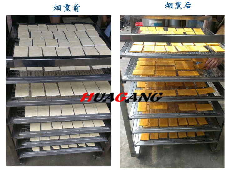 1.首先將壓好裁成塊的豆腐干放在我們提供的煙熏推車托盤上,一般煙熏推車根據型號和產量上面可放置6-18層不銹鋼盤子,將每層的盤子/篩子全部擺滿豆腐干。注意:每塊直接要留一公分的間隙。2.將放滿豆腐干的推車推到煙熏爐里面。關上爐門,通過豆干煙熏爐左側控制按鈕或者PLC電腦控制面板,設定溫度和時間,即可升溫,表皮稍微烘干后打開發煙開關,煙霧即可在煙熏爐爐體內部煙熏豆腐干。煙熏時間到后自動報警,關閉發煙開關,打開排煙開關,將煙霧排到室外后,打開煙熏爐,即可看到煙熏完成的豆腐干。