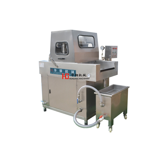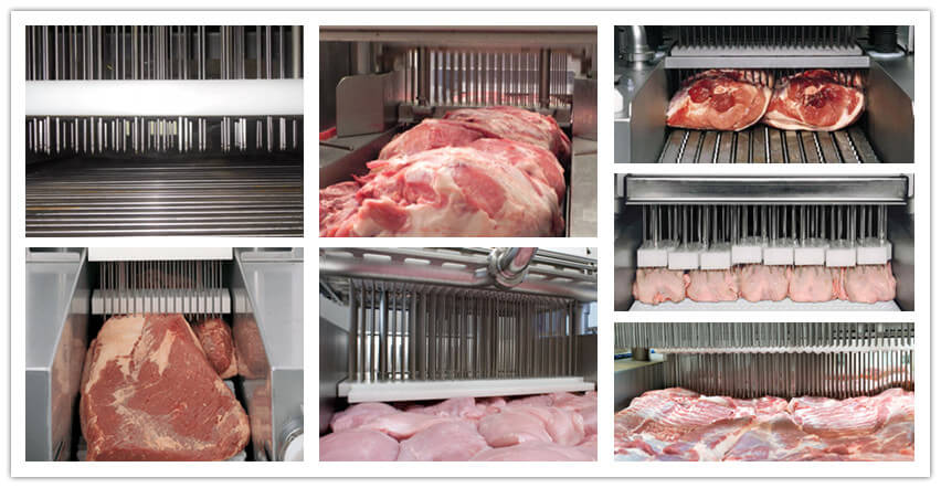 鹽水注射機是利用機械裝置將腌制劑通過注射針注射入產(chǎn)品,使之在產(chǎn)品內(nèi)均勻分布達到快速腌制、增加調(diào)味、保持肉食營養(yǎng)、強化口感的目的。