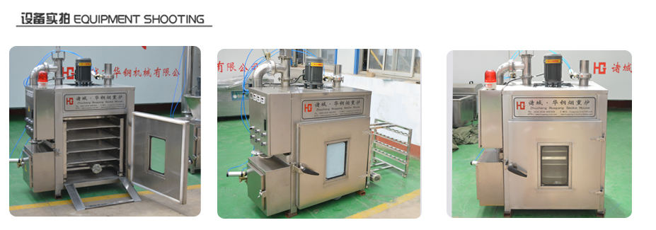 主機采用SUS304不銹鋼材質.符合食品級要求! 該煙熏爐設備發煙裝置為外置發煙,在爐外側發煙箱內直接放置