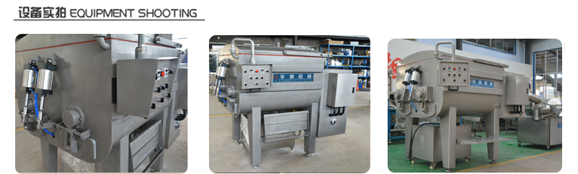 通過真空裝置使物料處于負壓狀態。使物流充分膨脹,無氣泡,彈性好,色澤鮮艷。并很大限度的提取蛋白質,是改善產品品質的理想設備。采用平行雙軸結構,斜板式槳葉,物料在料斗中翻動的同時作圓周運動,使各種物料攪拌的更加均勻.采用雙速雙動力,根據所拌餡料的種類及工藝選擇不同的轉速和不同的運轉方式進行攪拌。真空密封裝置全部采用符合衛生標準的密封件。在真空狀態下,餡料攪拌均勻,充分膨脹,彈性好,色澤鮮艷并很大限度地提高蛋白質。上蓋及排料門的密封用硅膠條,操作方便,可靠耐用.