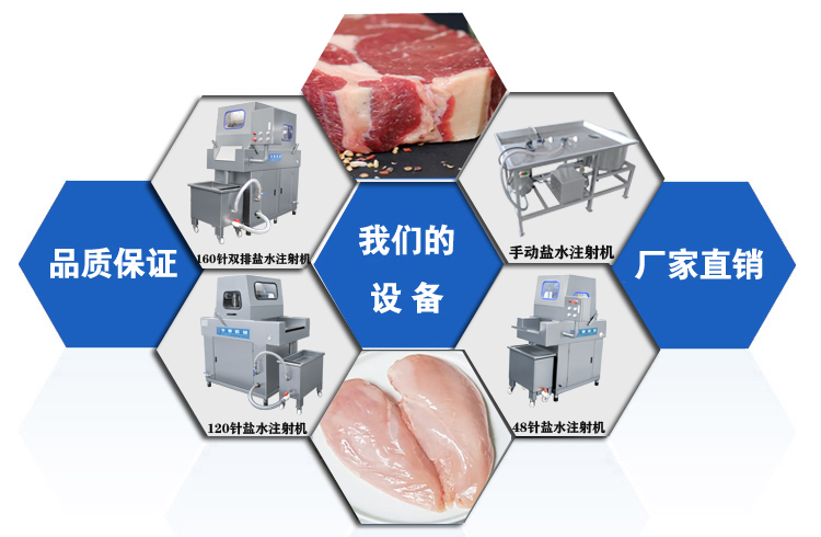 鹽水注射機原理是鹽水及輔料注入肉中充分腌漬,注入配制的水溶液能使肉制嫩化、松軟,注射時可根據不同的工藝要求,調整步速度,步進距離,壓肉板間隙及注射壓力較弱,將腌漬液均勻地注入肉中,達到理想的注射效果,同時采用不銹鋼材料制作,設計合理,送肉鏈條可全盤托出,清洗方便,設有自動保護裝置,當注射針頭碰到硬和時,注射針自動彈起,不受損壞,真正達到了注射的肉無死角,本機采用不銹鋼制作,設計嚴謹、結構合理、操作簡便、傳動鏈板可拆卸,清潔衛生,清洗方便,是肉制品加工企業必不可少的設備。
