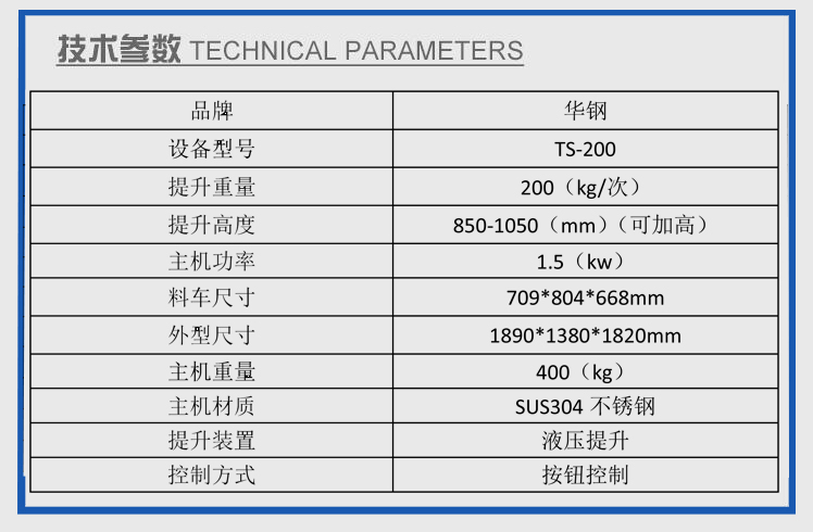 使用液壓油提升,保持上料平穩,出料干凈,提升高度可調,速度可調,單次提升能力為200KG,是食品廠減輕工人勞動強度的設備,本機采用不銹鋼制作,外型美觀,經濟實用,一臺上料機可供幾臺滾揉機上料交替使用,設備四腳帶輪子,可移動,并帶有剎車系統,上料時不會隨意移動保證了設備的使用安全.