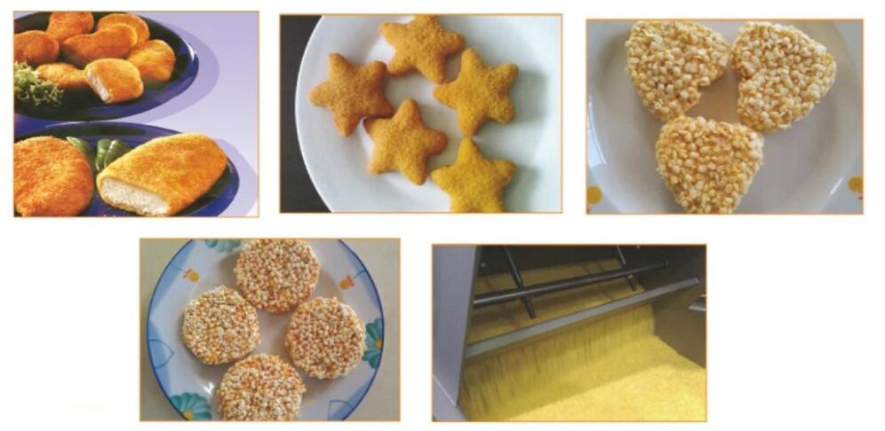上面包屑機是通過料斗里泄出的面包屑和網帶上的面包屑將面包屑均勻裹涂在雞肉、牛肉、